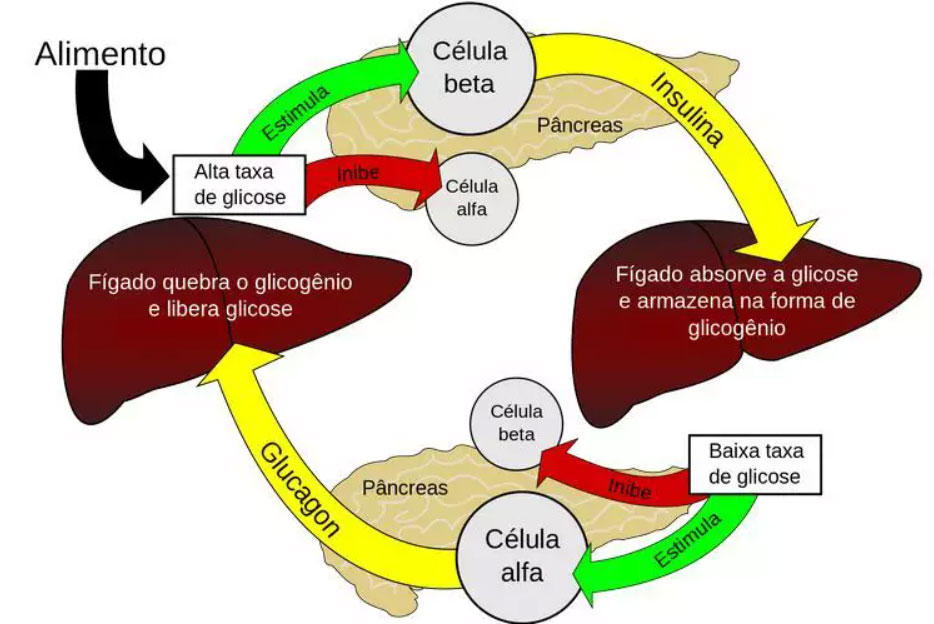 Uma dos funções do fígado é absorver a glicose, metabolizar e armazenar em forma de glicogênio, liberar um hormônio que quebra o glicogênio e libera glicose para a célula. Veja a imagem abaixo!